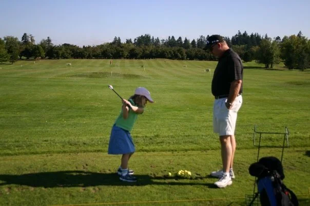On the range being coached by her Dad John at OGA Golf Course in Woodburn, Oregon at age six